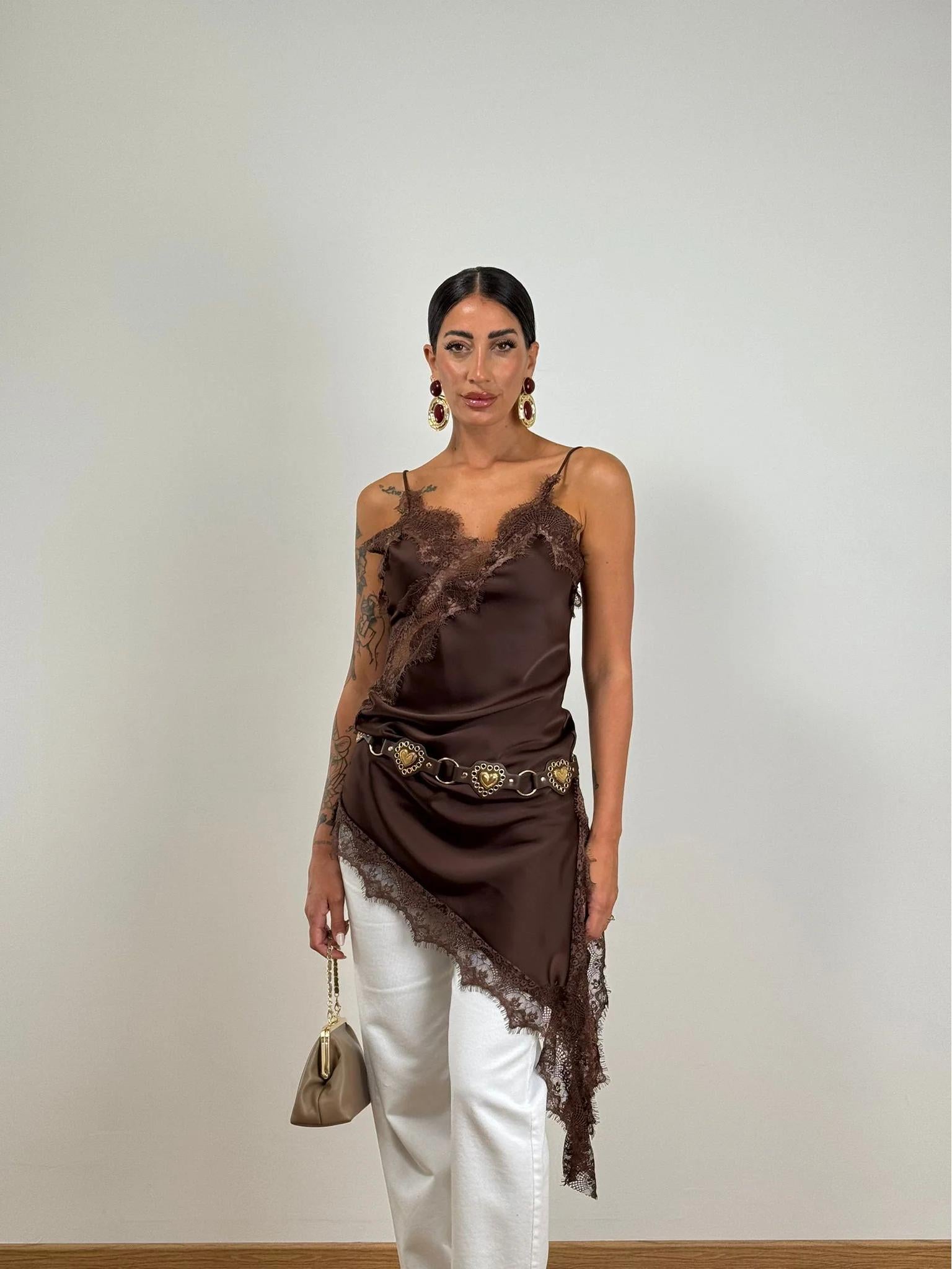 This elegant brown slip mini dress embodies effortless allure with its delicate lace detailing and romantic silhouette. Designed to highlight feminine charm, it combines sophistication with a modern edge.