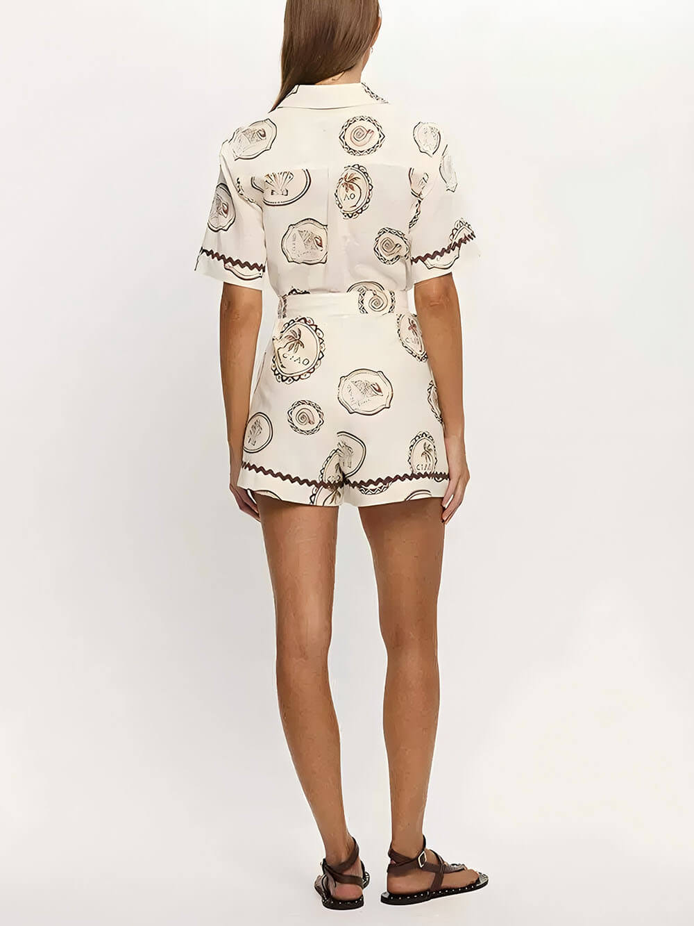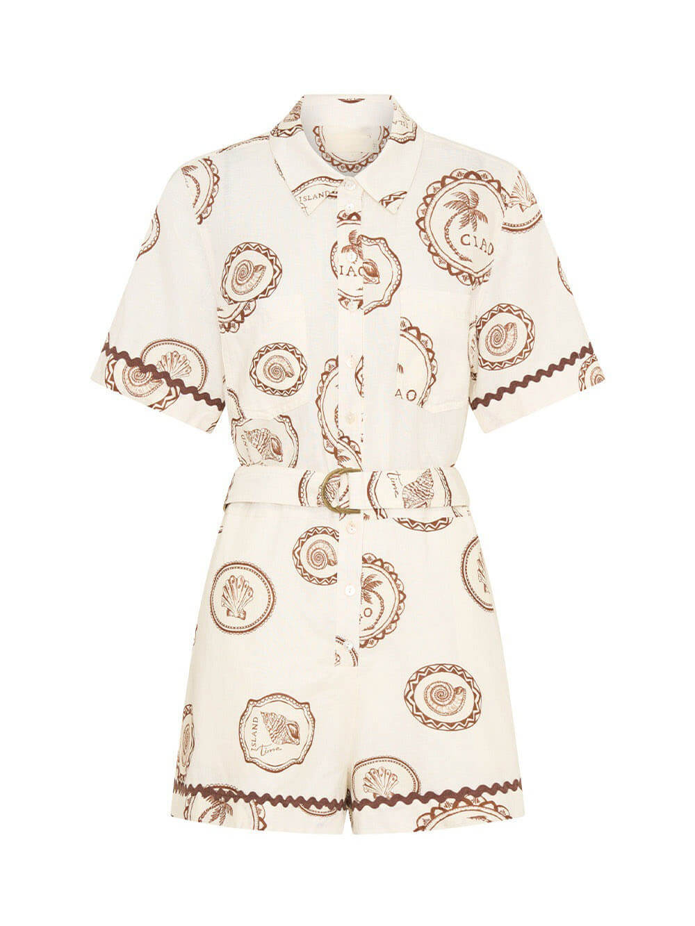 Elegant Lace-Up Linen Shell Print Cardigan Jumpsuit