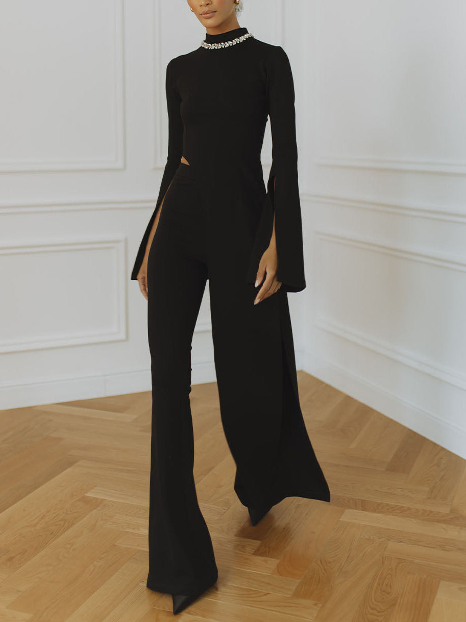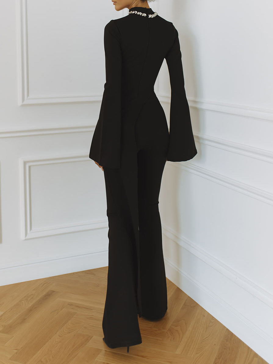 This elegant two-piece set includes a rhinestone-embellished, color-blocked, asymmetrical T-shirt and slightly flared trousers. The shimmering embellishments and asymmetrical silhouette add a touch of modern glamour, while the fitted trousers create the illusion of longer, more shapely legs.