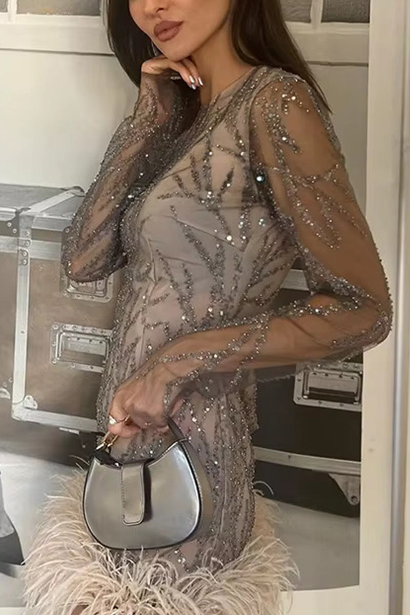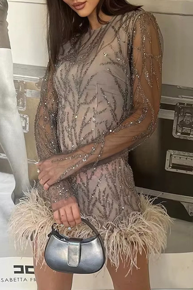 Elegant Mesh Tinsel Feather Hemline O Neck Mini Dresses