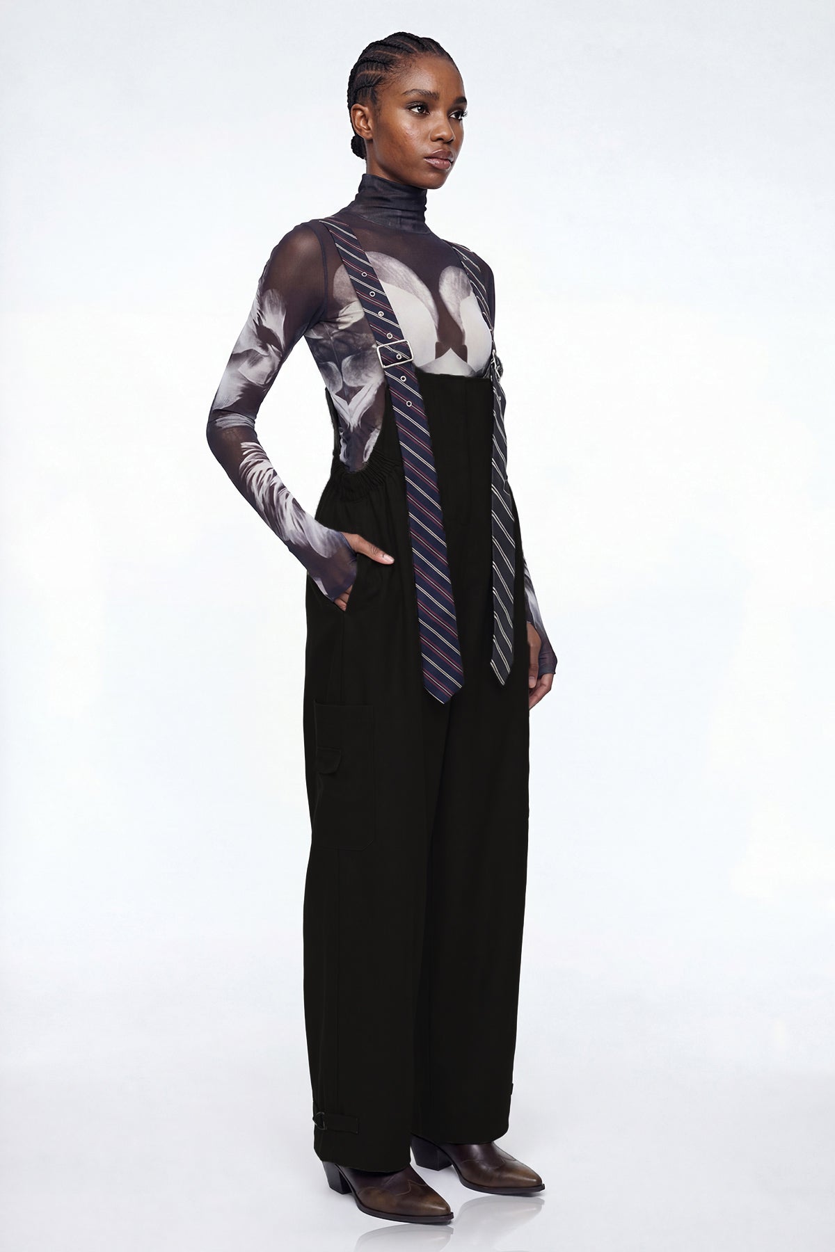 Elisaveta Tie Denim Overalls In Black combine timeless workwear styling with contemporary design details. Crafted from durable denim, these overalls feature adjustable tie straps that offer a customizable fit and flattering silhouette. The classic black wash pairs effortlessly with any wardrobe, while functional pockets and reinforced construction ensure lasting wear. Perfect for creating versatile looks—from casual streetwear to layered styling—these overalls deliver both practicality and understated sophistication.