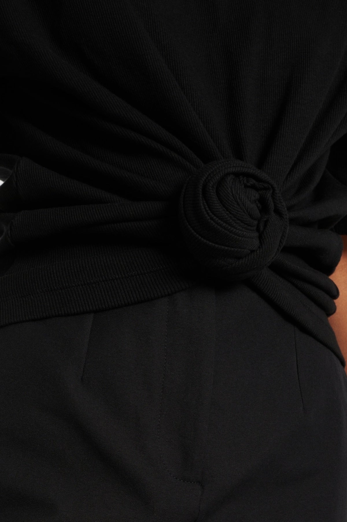 Introducing the Orlina Knotted T-Shirt in black. Crafted with luxurious fabric, this tee features a modern knot design for a touch of sophistication. Perfect for elevating any casual outfit, it offers both style and comfort. Add a touch of playful to your wardrobe with the Orlina Knotted T-Shirt.
