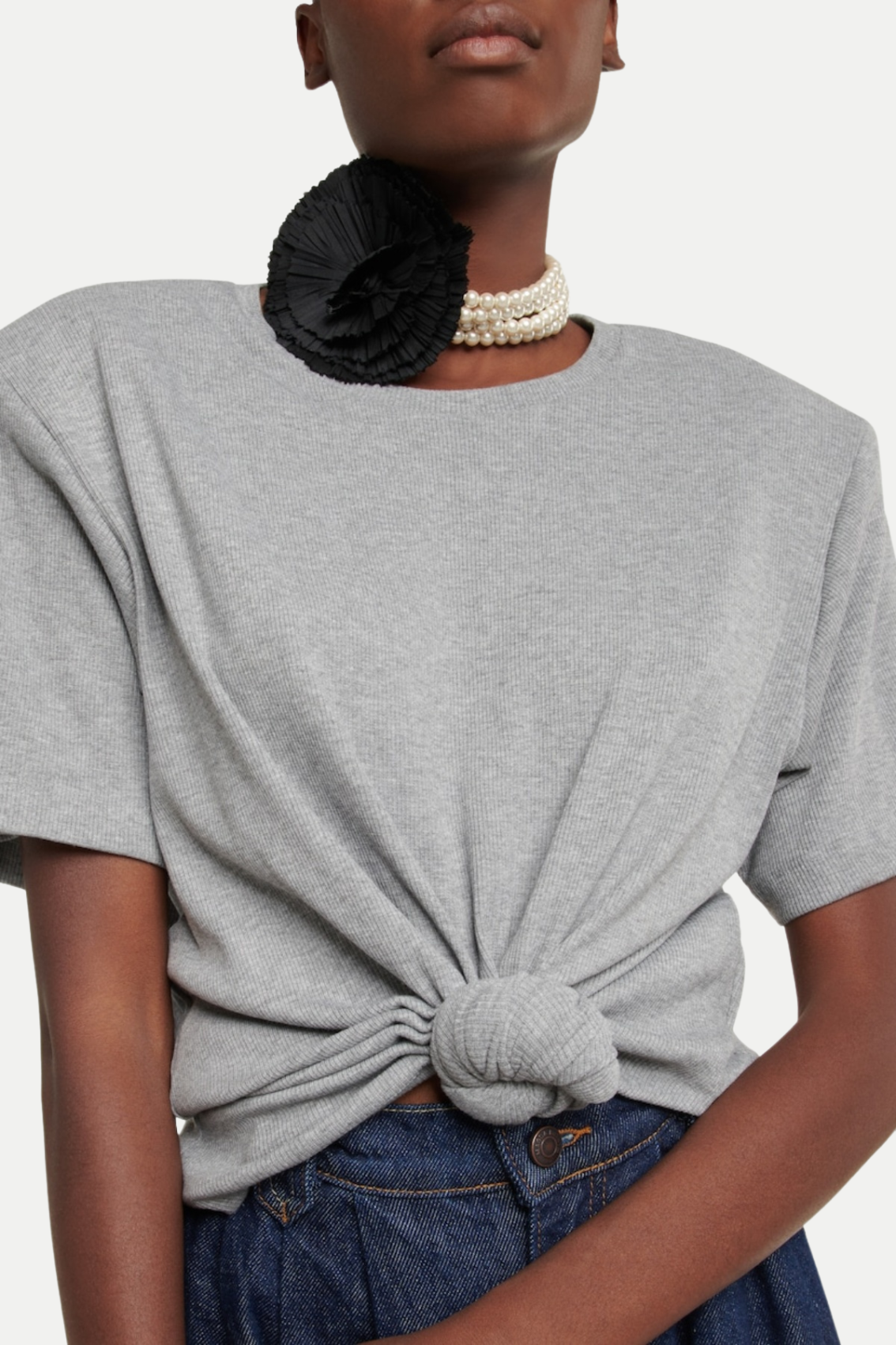 Introducing the Orlina Knotted T-Shirt in grey. Crafted with luxurious fabric, this tee features a modern knot design for a touch of sophistication. Perfect for elevating any casual outfit, it offers both style and comfort. Add a touch of playful to your wardrobe with the Orlina Knotted T-Shirt.