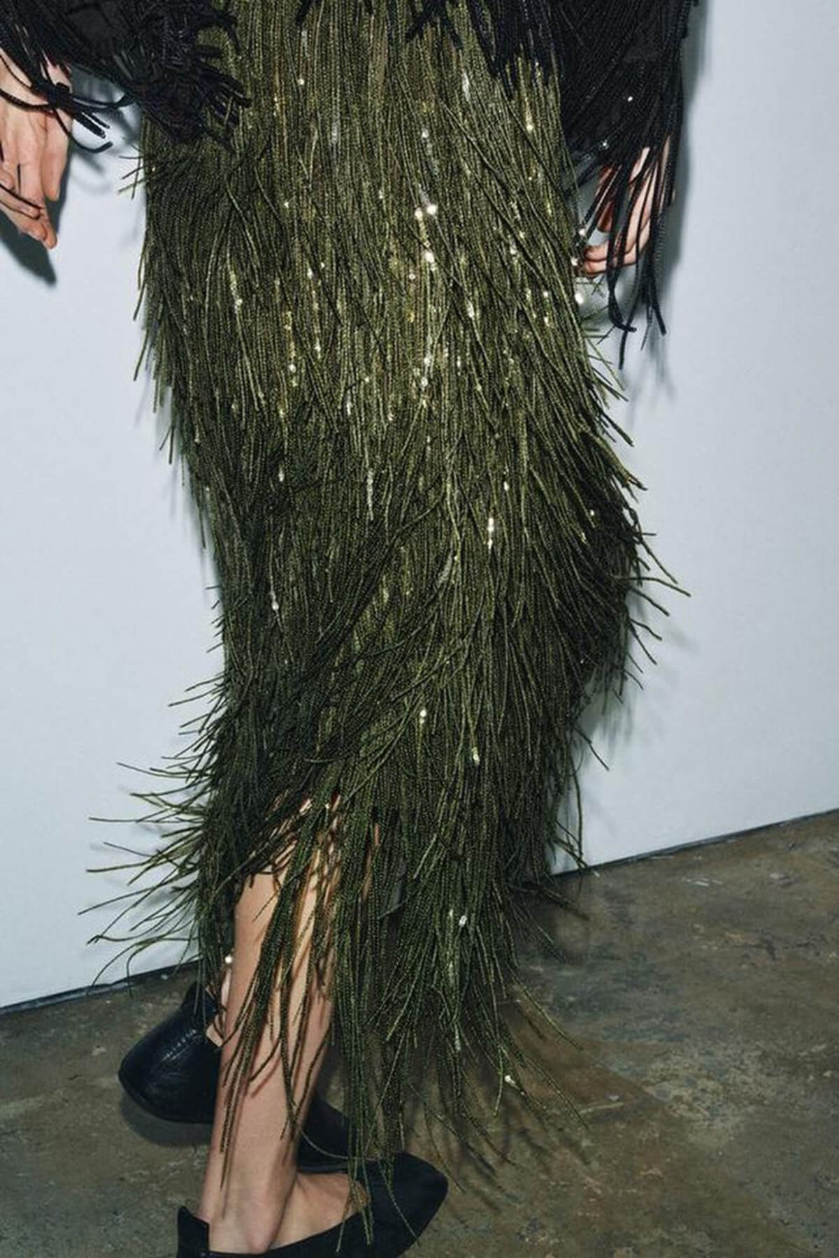 Shimmer with sophistication in this fashion-forward sequin fringe midi skirt. The elegant sparkling sequins catch the light from every angle, while the flowing fringe detailing adds playful movement and refined glamour. Designed with a flattering mid-length silhouette, it perfectly balances elegance and allure _ ideal for evening parties, celebrations, or any moment that calls for a touch of sparkle. Pair it with a sleek top and heels for an unforgettable statement look.