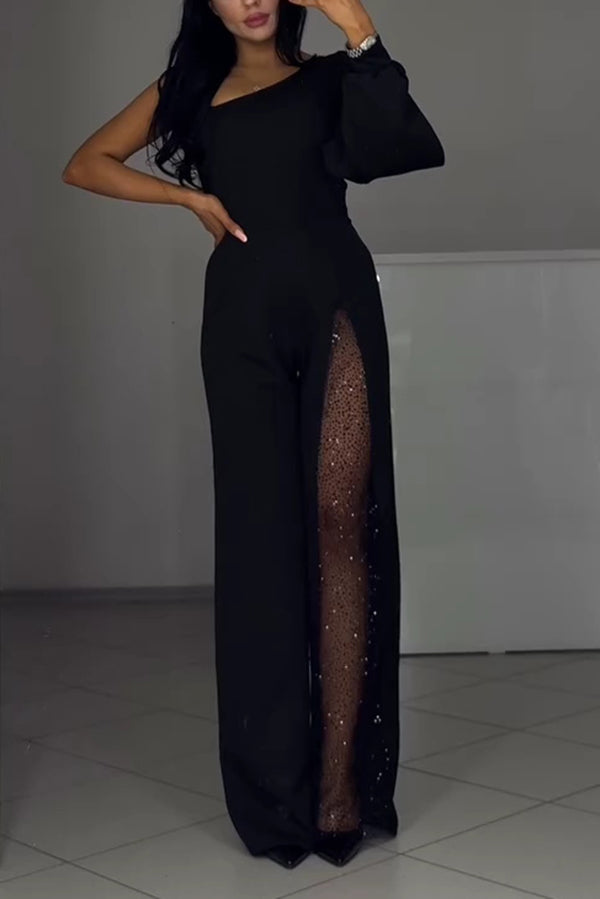 Fashionable Oblique Shoulder One-sleeve Sexy High Slit Slim Jumpsuit