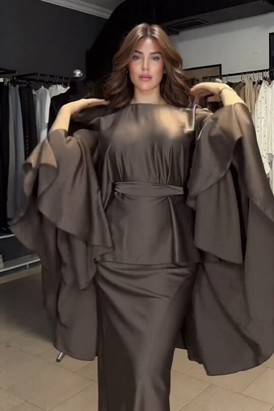 Step out in contemporary elegance with this fashion-forward two-piece set, featuring a round-neck top with stylish irregular batwing sleeves and a fitted maxi skirt that flatters your silhouette. Crafted from lightweight, comfortable fabric, this set balances relaxed sophistication with a polished, streamlined look. Perfect for brunches, casual gatherings, or stylish day-to-night occasions, it delivers effortless chic with modern flair.