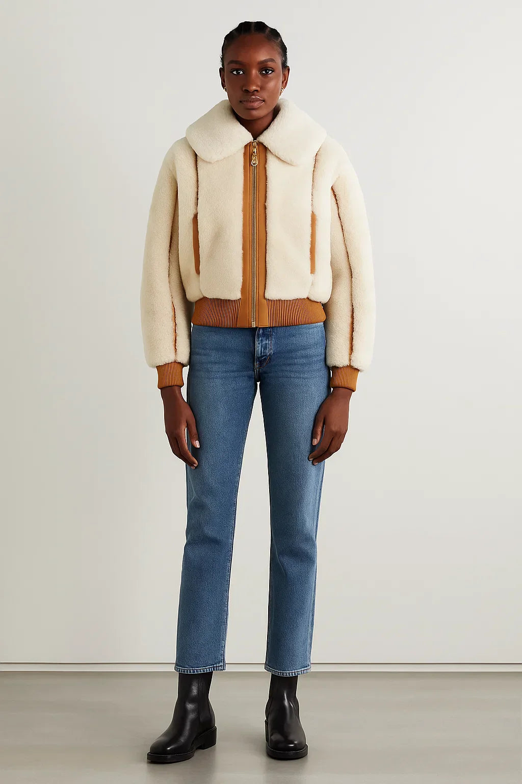 A contemporary bomber jacket reimagined in plush fleece. This cropped silhouette is defined by its soft shearling-effect texture and warm caramel contrast panels. The design balances relaxed volume with structured details, making it both cosy and modern.