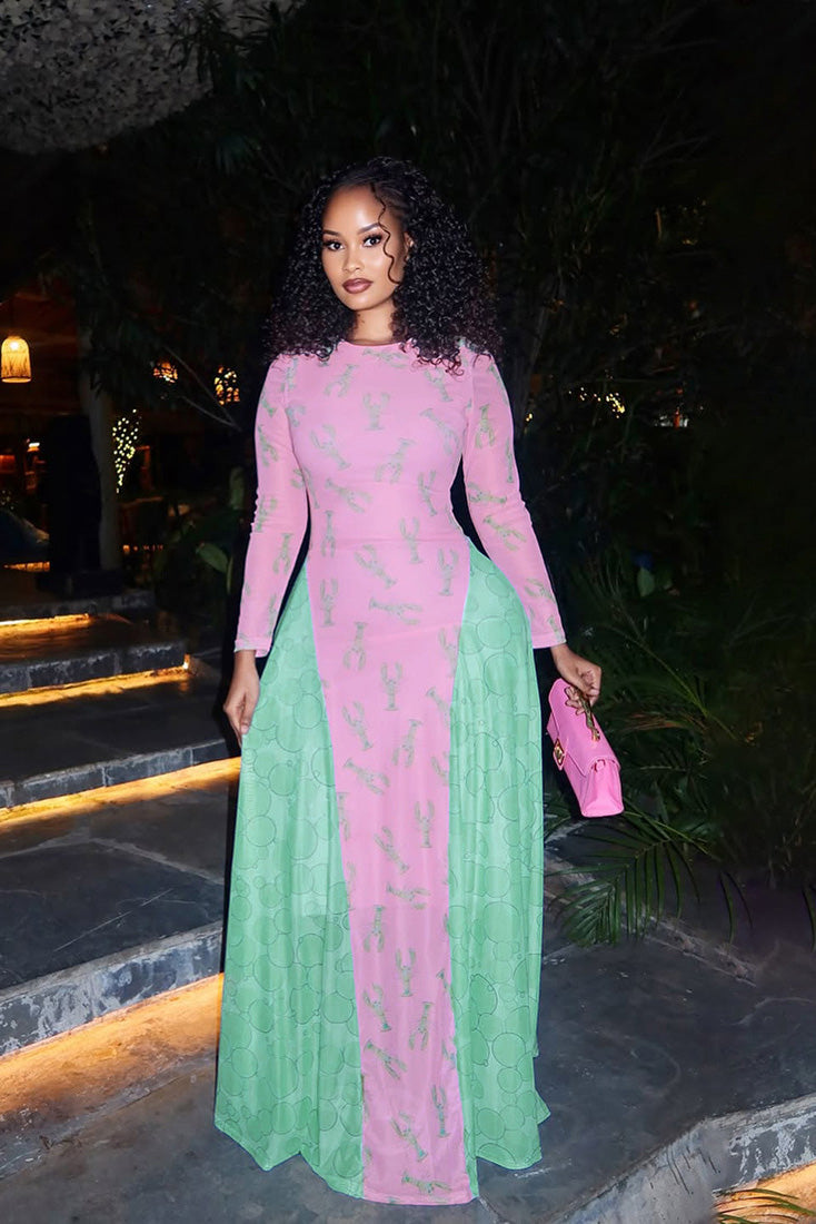 A playful explosion of vacation energy. This pink lobster print maxi dress features a body-hugging upper bodice with sheer sleeves that highlight your curves, while the high waist and dramatic A-line skirt with high slit and circle-patterned hem create effortless leg-lengthening flow. The signature lobster motif in vibrant green on soft pink fabric brings bold, whimsical fun. Lightweight, breathable material moves beautifully for all-day comfort. Perfect for beach weddings, resort parties, girls' trips, summer dates, or Instagram-worthy vacations. Pair with strappy sandals and gold jewelry for maximum impact—one dress that screams fun maximalism.