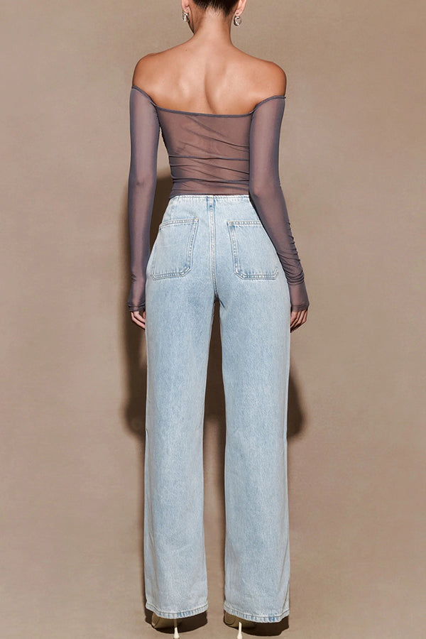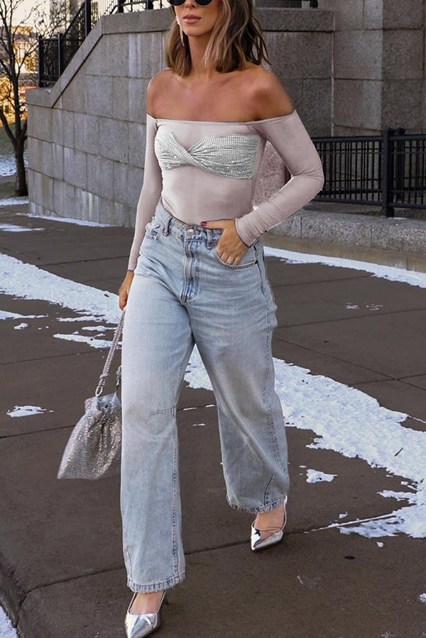 - Designed with a bardot neckline and long sleeves, this top showcases an alluring off-shoulder style that highlights your collarbone. The mesh fabrication gives it a modern, sultry look, while the diamante-encrusted bust adds a touch of sparkle and luxury. A twist front detail enhances its unique style, making this top perfect for elevating your evening look with effortless sophistication.