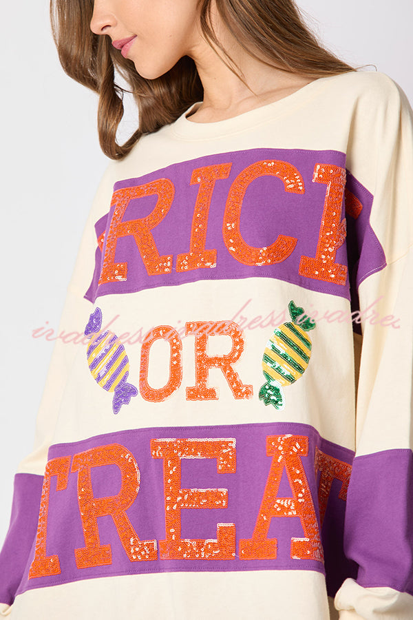 Halloween Letter Sequined Color Block Loose Casual Sweatshirt