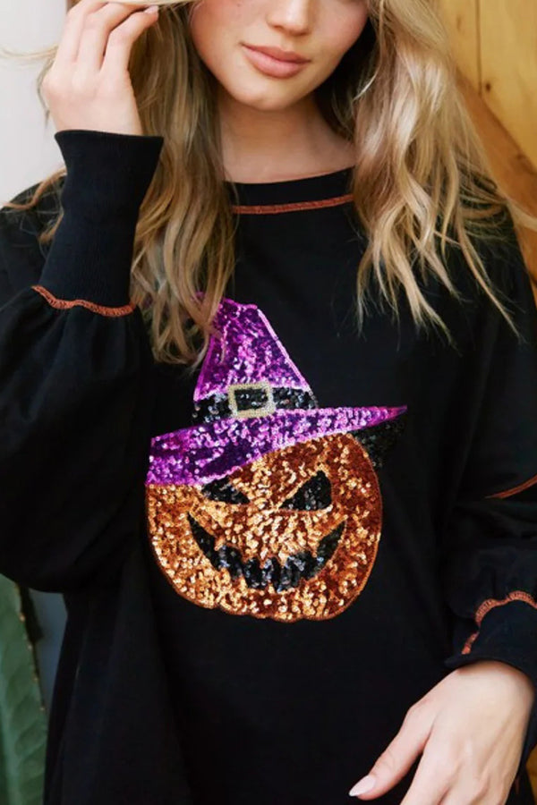Halloween Sequined Pumpkin Loose Casual Sweatshirt