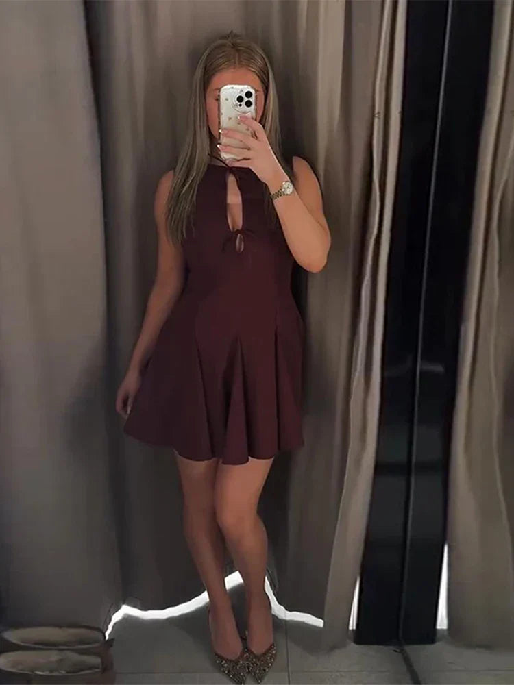 Hollow Out Bow Solid Sleeveless Pleated Dress