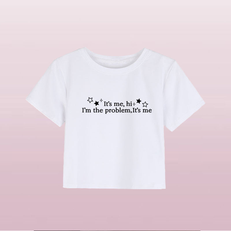 The standout feature of this top is the bold text on the front, It's me, hi I'm the problem, It's me" surrounded by small star graphics that add a touch of whimsy and personality
