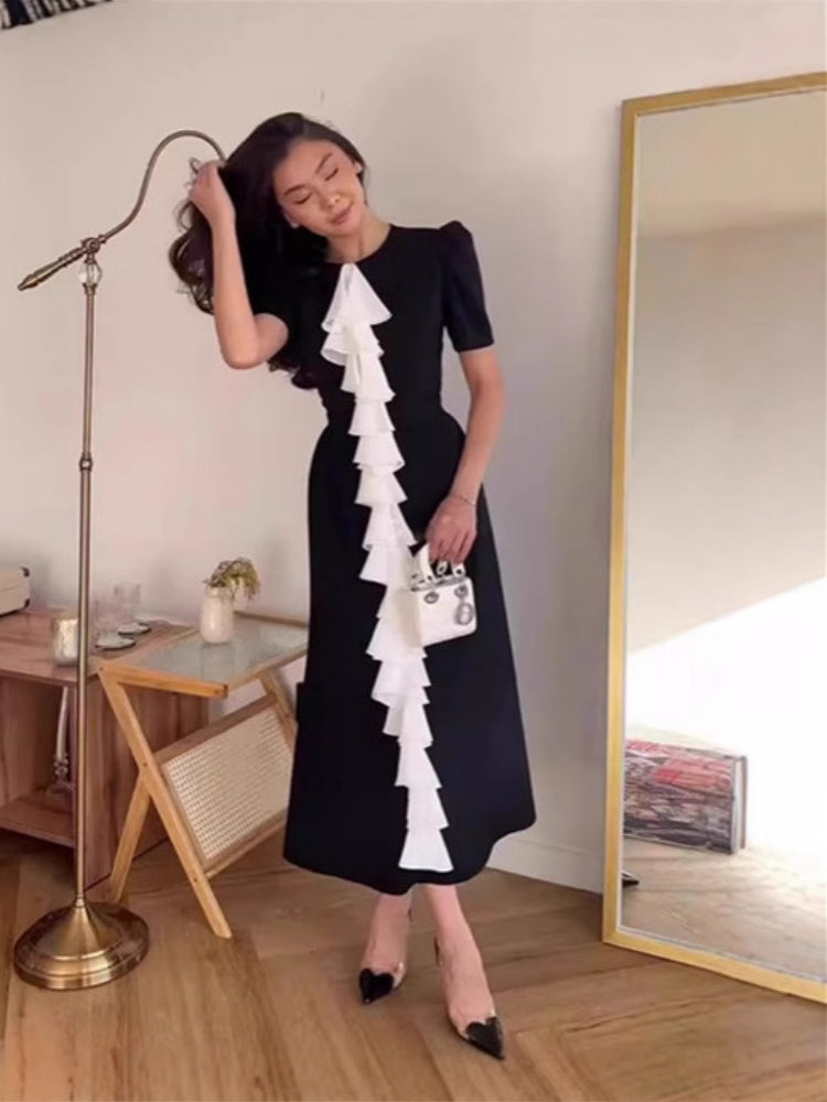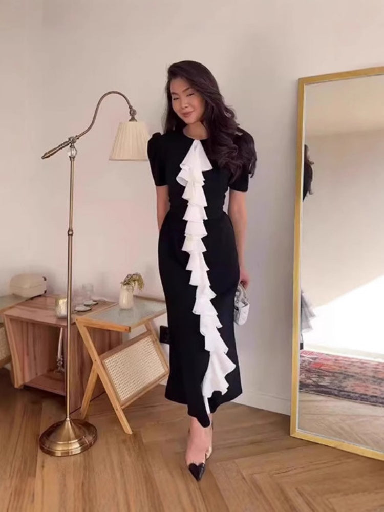 This innovative jacquard midi dress combines a structured bustier top with color-block panels and flowing drape details for a modern silhouette. The body-hugging fit accentuates curves while the asymmetric hem adds artistic flair. Perfect for fashion events, parties, or evening occasions.
