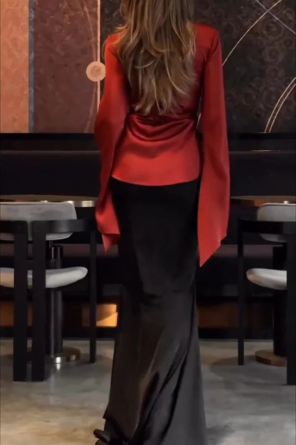 Jenny Satin Button Front Center Cross Straps Long Bell Sleeve Shirt