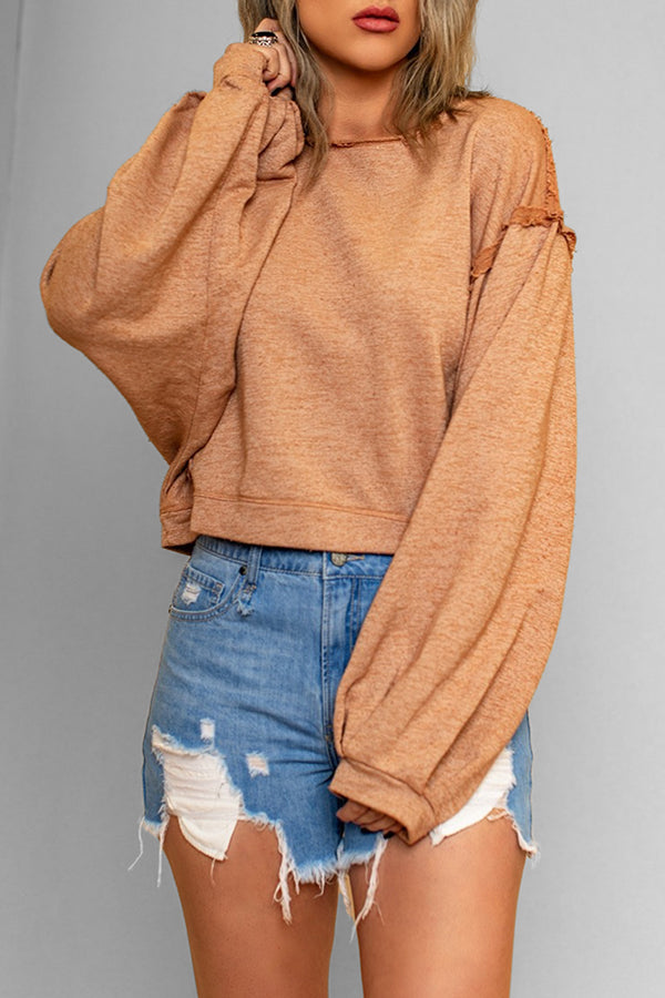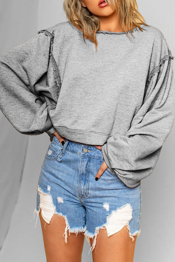 Lantern Sleeve Solid Color Round Neck Raw Edge Hoodie