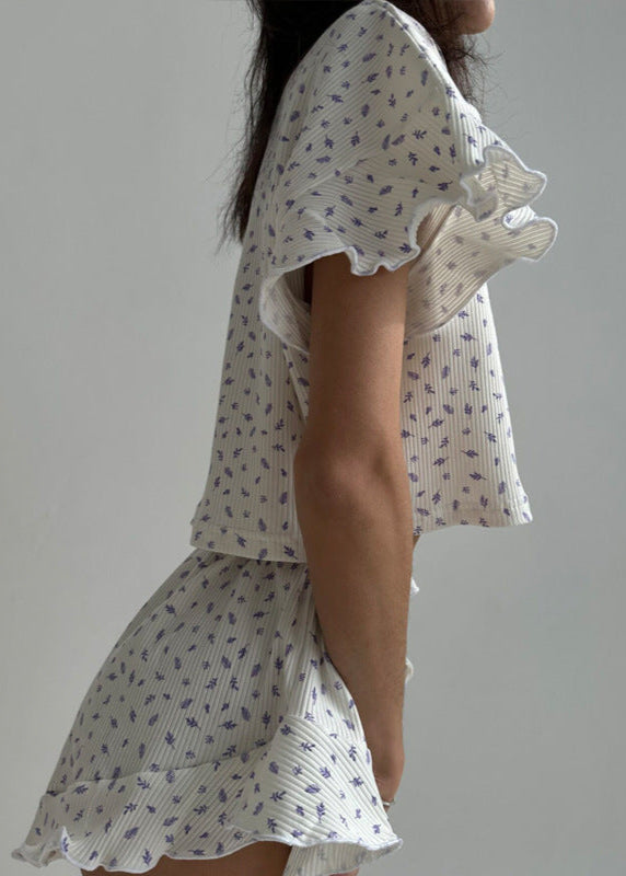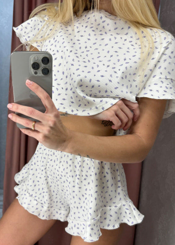 Lavender Bliss - Ruffled Lounge Set is a dreamy combination of comfort and charm. This two-piece set features a relaxed crop top with flutter sleeves and delicate button details, paiRed with ruffled elastic-waist shorts for a playful touch. The soft, breathable ribbed fabric is adorned with a subtle floral pattern, creating a cozy yet stylish lounge essential. Whether you're unwinding at home or enjoying a slow morning, this set offers effortless elegance with a feminine feel.