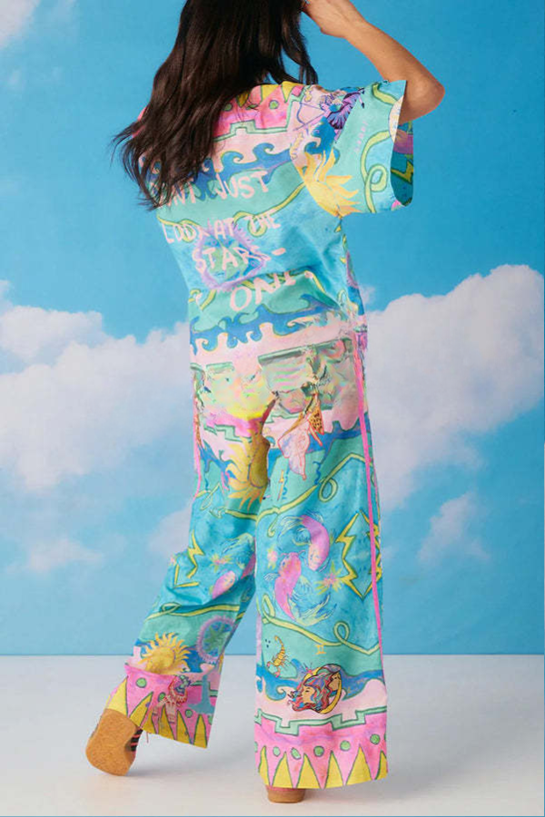 Linen Blend Unique Print Short Sleeve Button Oversized Blouse