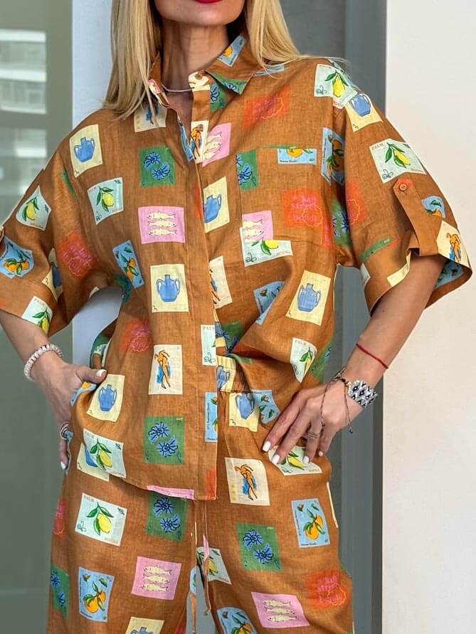 Loose Wide-Leg Trousers With Ethnic Botanical Floral Print-Set