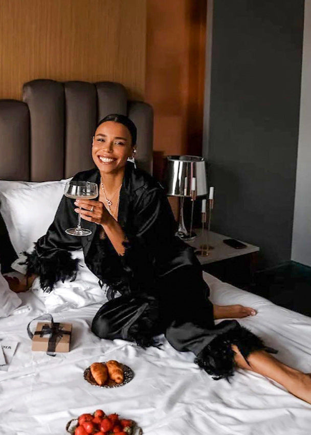 The Luxe Satin Feather Trim Set is your go-to for glamorous lounging and elevated evenings at home. Made from ultra-soft satin with a radiant finish, this two-piece set features a relaxed-fit button-down top and wide-leg pants. Feather trim accents at the cuffs and hems add a bold, playful twist to the classic silhouette. Lightweight and breathable, it delivers effortless comfort while making a striking impressionโideal for self-care nights or chic at-home entertaining.