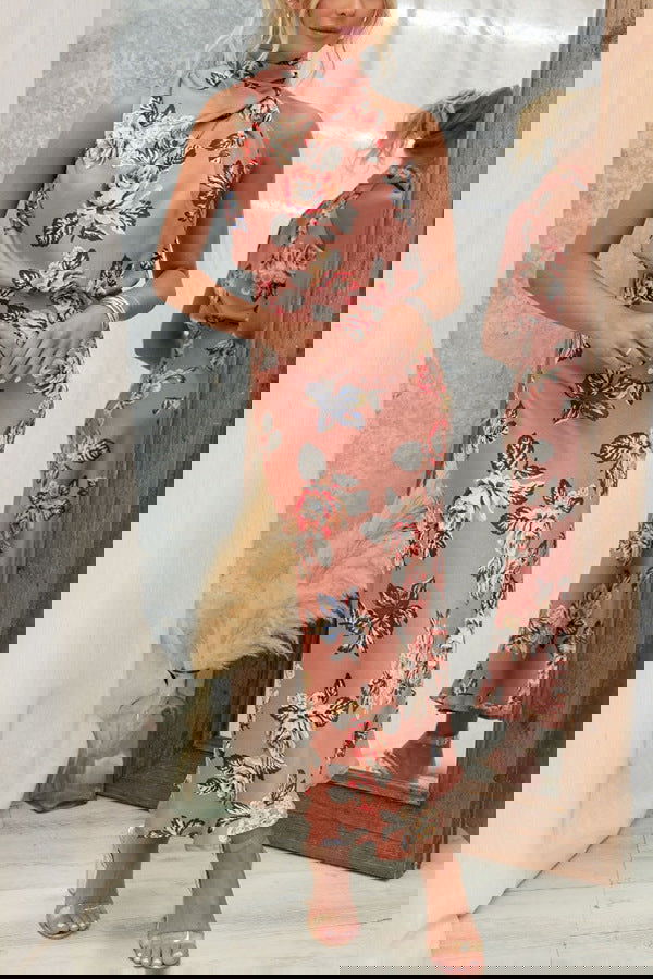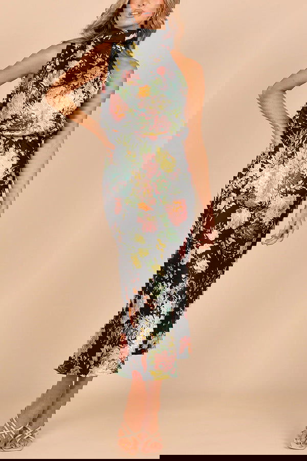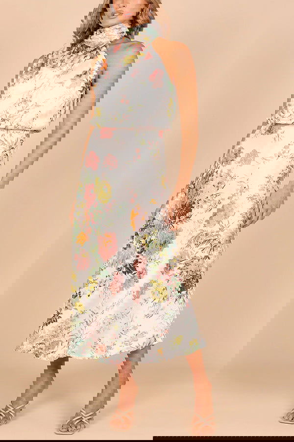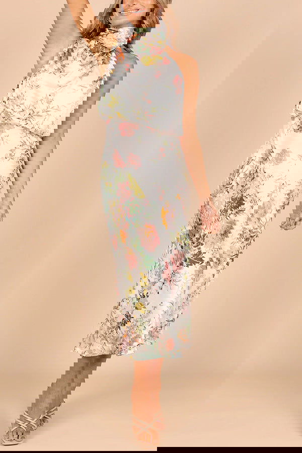 Mature Elegant Sleeveless Halter Printed Satin Dress