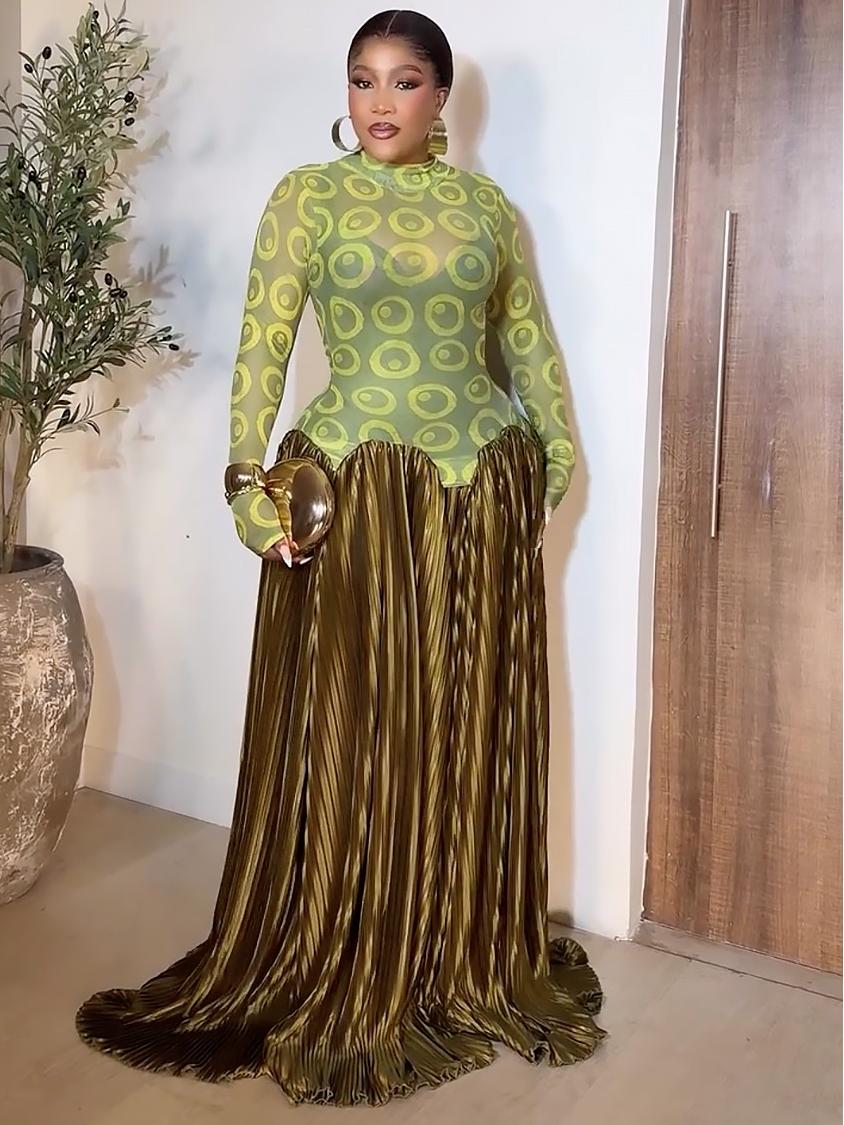 Mesh Panel Retro Pleated Maxi Dress