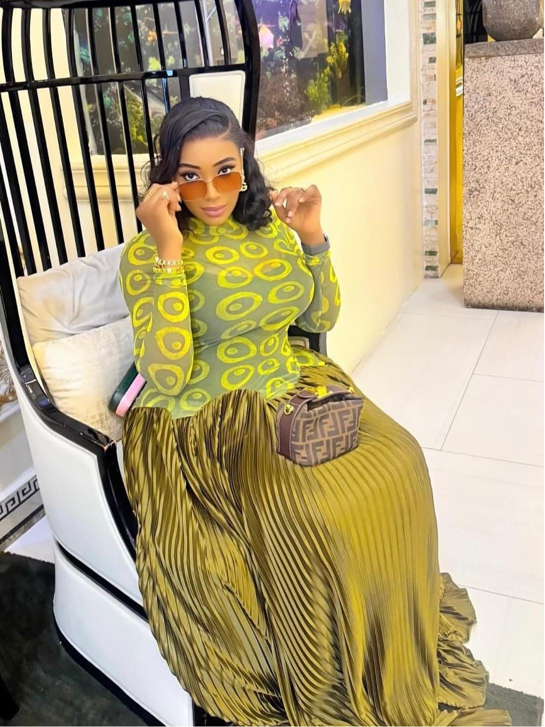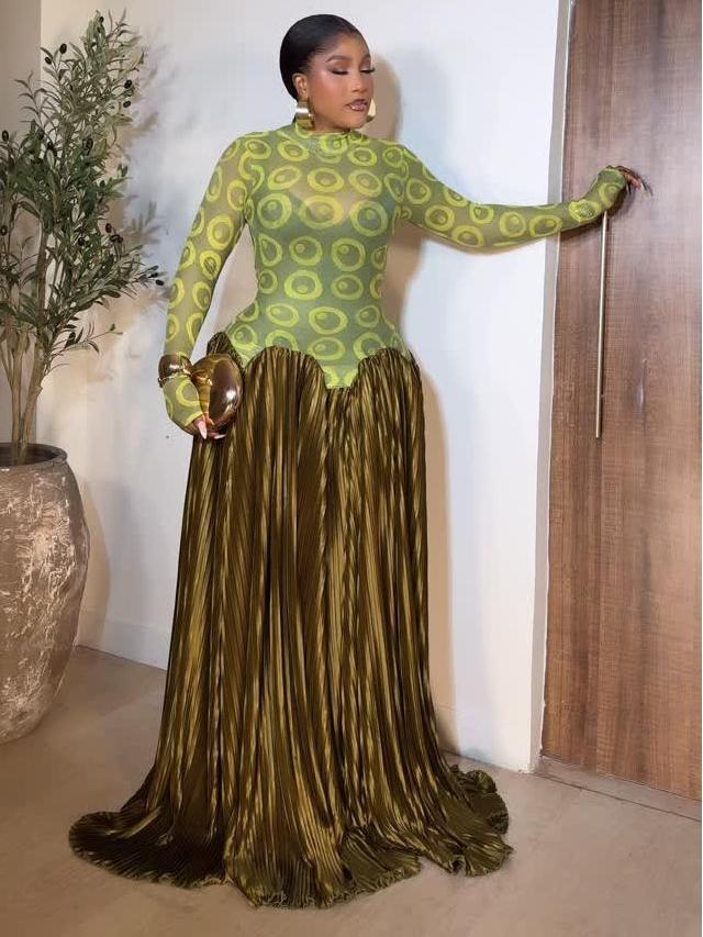 This olive-gold pleated maxi skirt is a masterpiece of texture and drama. Crafted from lustrous, accordion-pleated satin that catches light with every movement, it drapes into a sweeping train for red-carpet grandeur. The high-waisted silhouette is cinched just below a scalloped, petal-cut edge where a sheer lime-green mesh bodysuit peeks through, blending bold transparency with sculptural volume. Perfect for galas, premieres, or any moment demanding unapologetic presence__pring through winter.