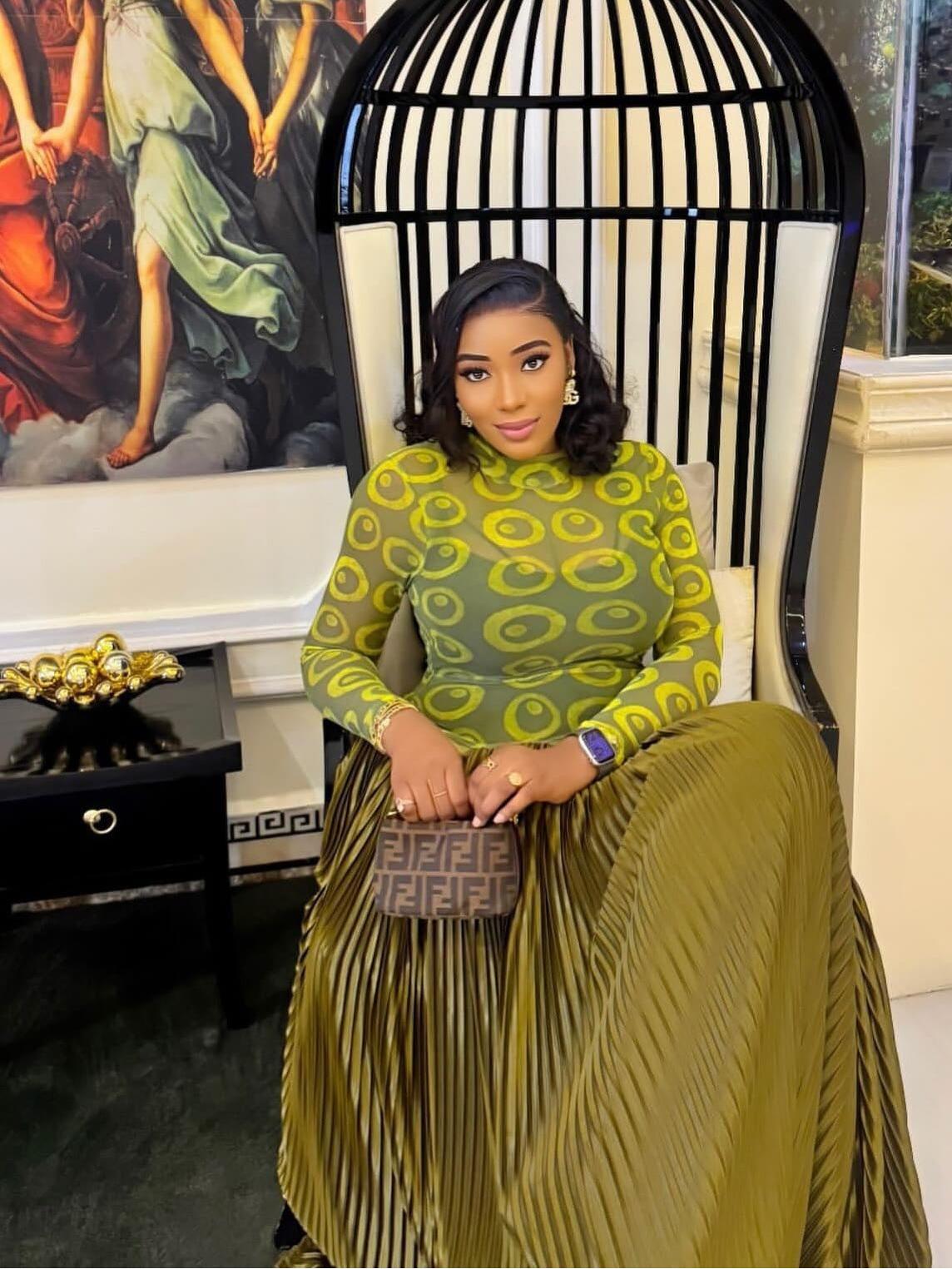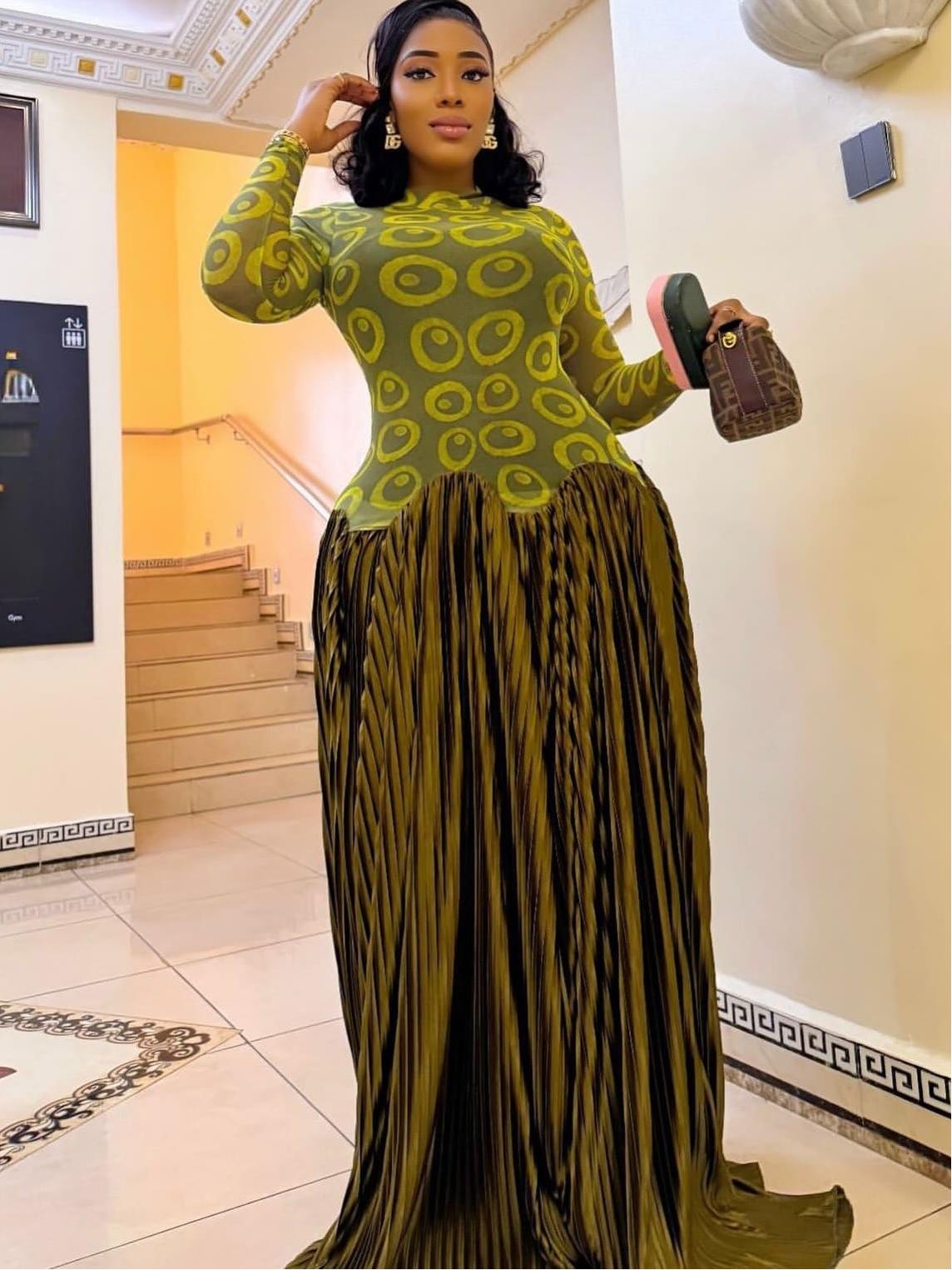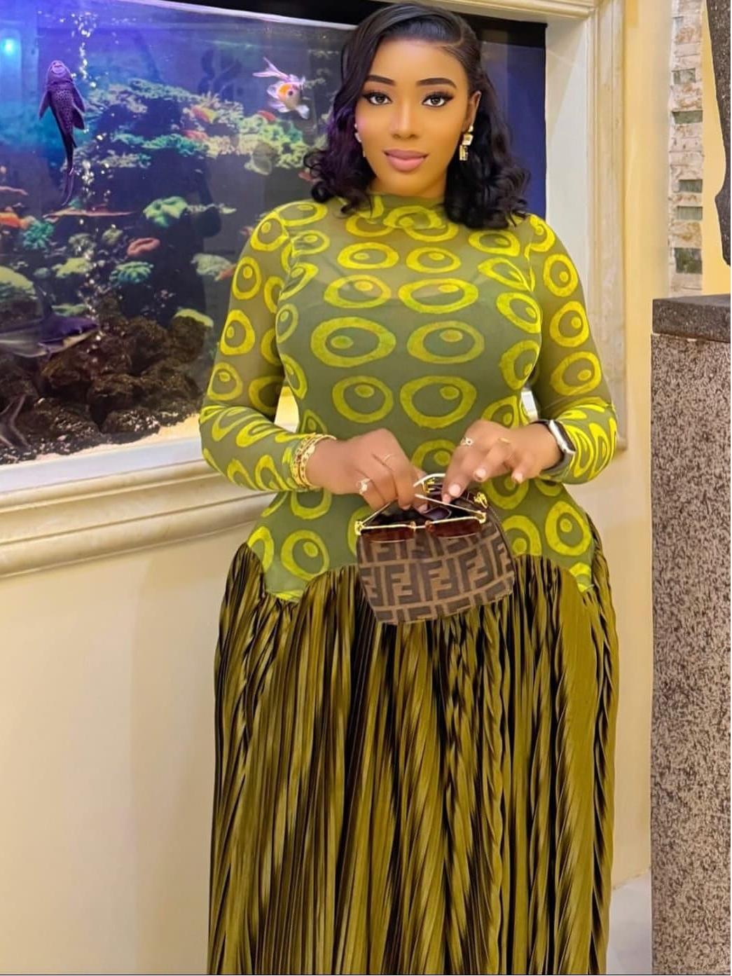 - Texture & Color: Deep olive-gold satin with micro-pleats that shimmer; lime-green circular mesh overlay adds graphic pop.