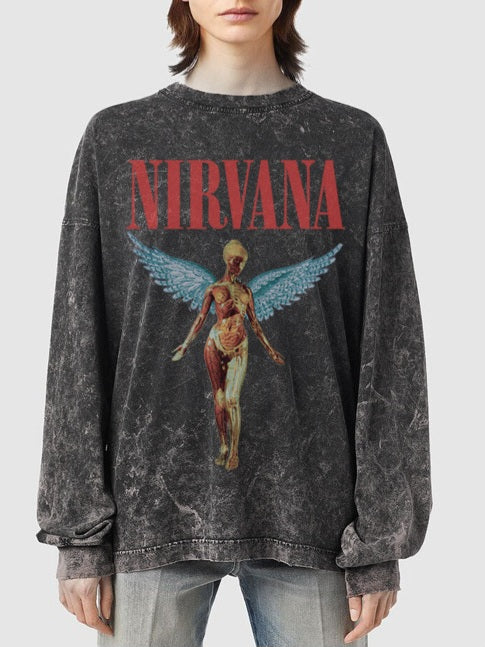 This sweatshirt features a bold 'Nirvana' lettering paired with a unique winged anatomical figure.