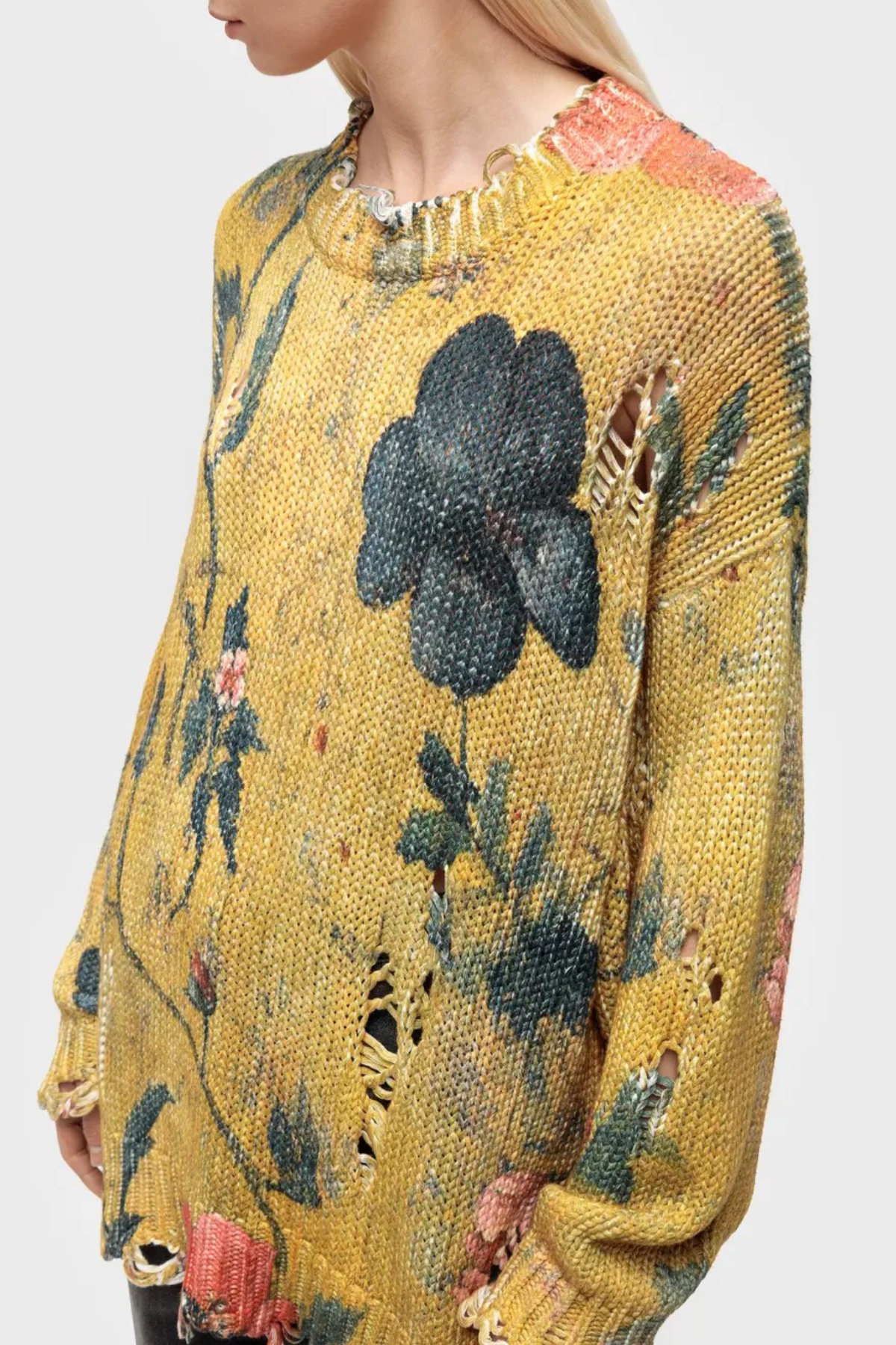 Elevate your casual wardrobe with the Omria Floral Print Distressed Sweater in serene green. This thoughtfully designed piece combines delicate floral detailing with intentional distressing, creating an effortlessly refined aesthetic. The soft knit fabric offers comfort for everyday wear, while the botanical print adds visual interest and sophistication. Perfect for layering or wearing solo, this sweater transitions seamlessly from season to season, making it a versatile addition to any discerning wardrobe.
