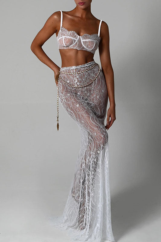 This sexy two-piece set features lace and milk silk fabric, with a double-layer crop top and a sheer lace mermaid maxi skirt. The backless design and floor-length silhouette highlight your curves, while the chain belt adds a touch of glamour. Perfect for evening parties, galas, and fashion-forward occasions.