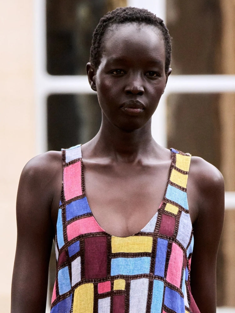A wearable canvas of texture and color, the Niki Maxi Dress transforms abstract art into flowing form. Handcrafted from Aurora-dyed linen yarns, each strand is individually hand-painted in color _ forming a patchwork of geometric rectangles separated by tactile trapezoids and raw stitch lines.