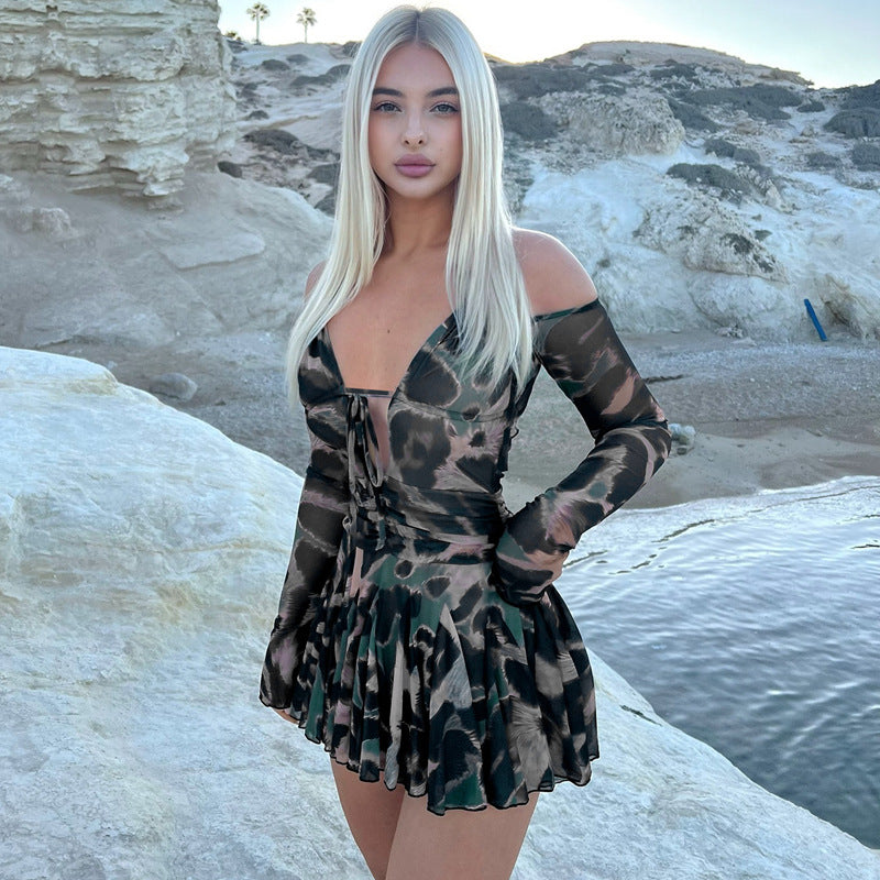 Pattern Print Long Sleeve Tether Halter Pleated Dress
