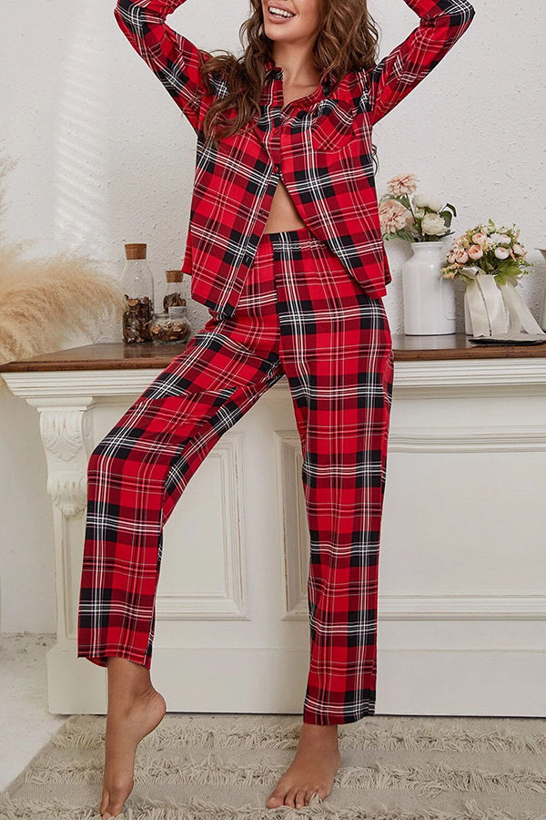 Christmas Plaid Print Pocket Button Pajama Set
