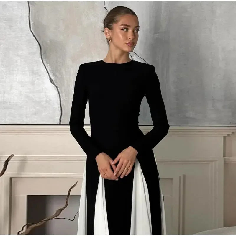 Pleated Patchwork Long Sleeve Maxi Dress