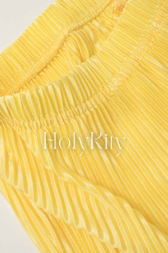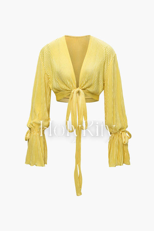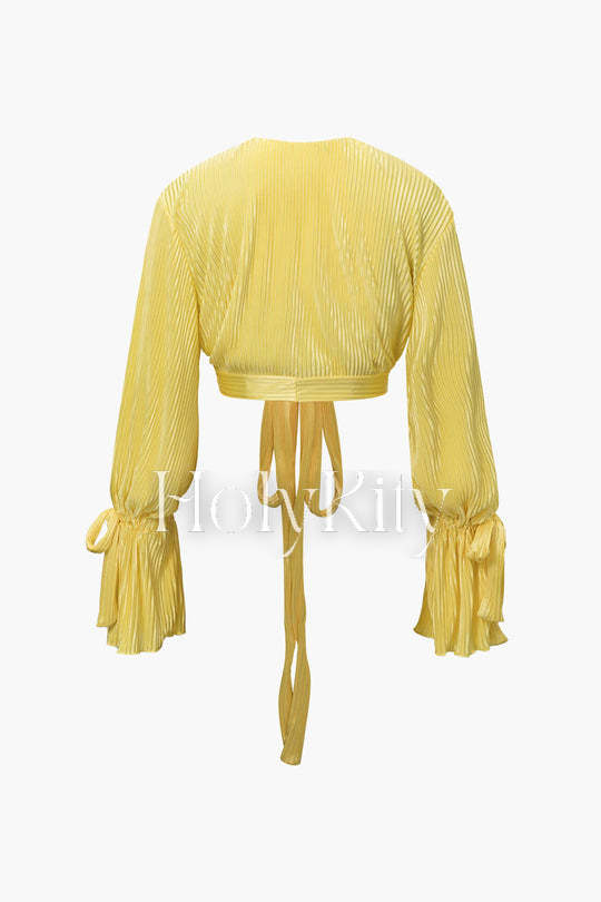 Plisse V-neck Tie Front Crop Top And Lettuce Hem Pants Set