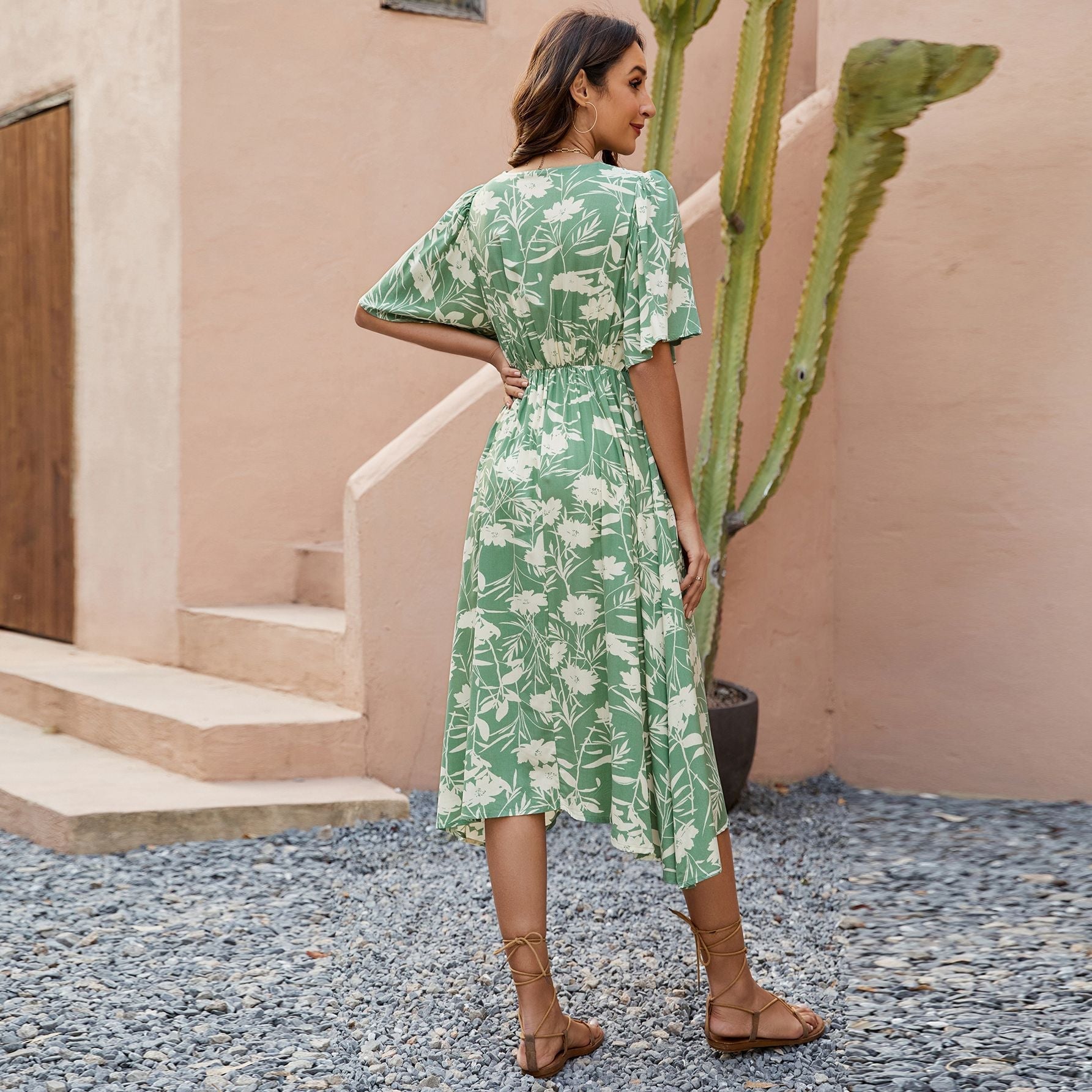 Printed V neck Short Sleeve Waist Controlled Dress Bohemian Holiday Party Beach Dress