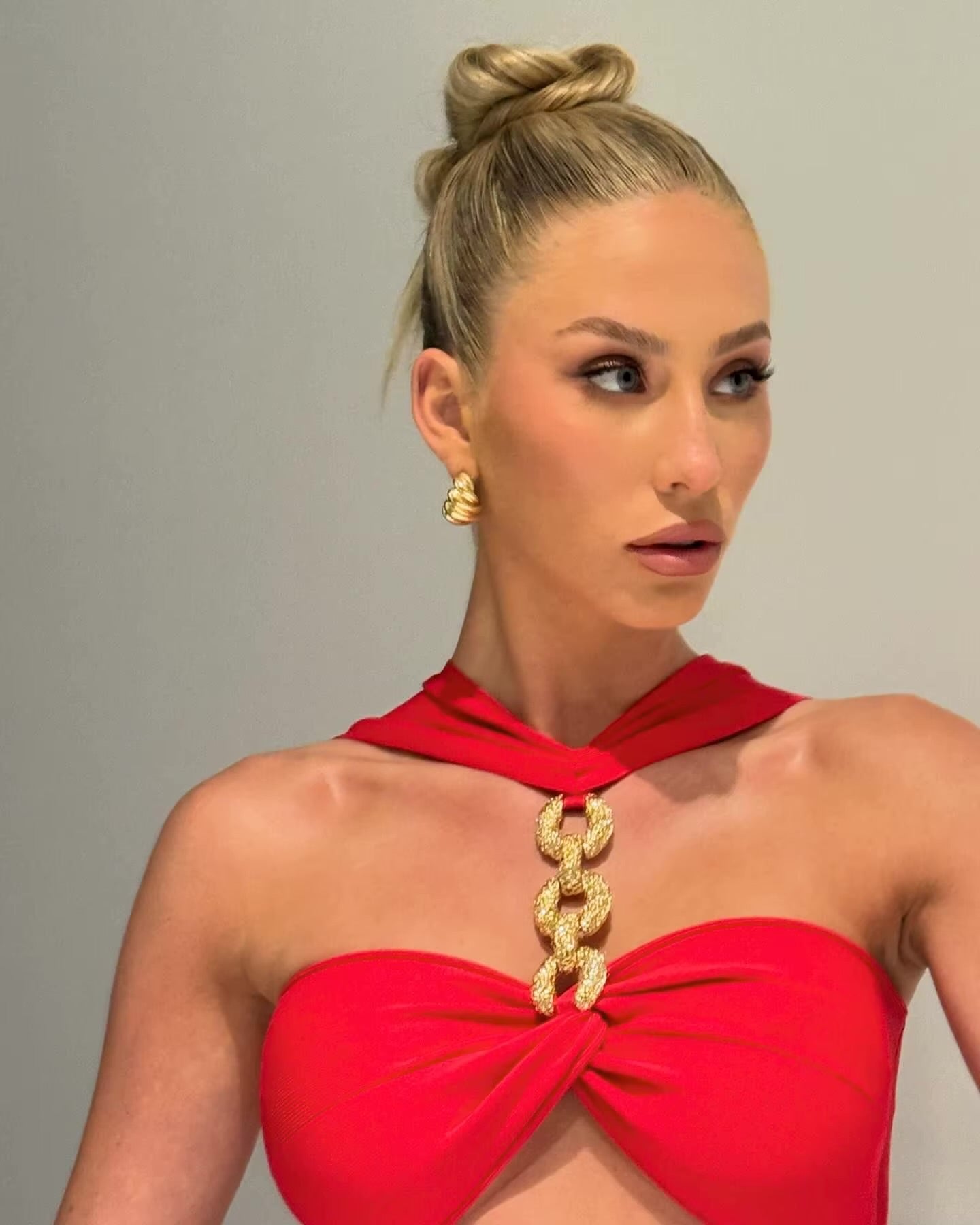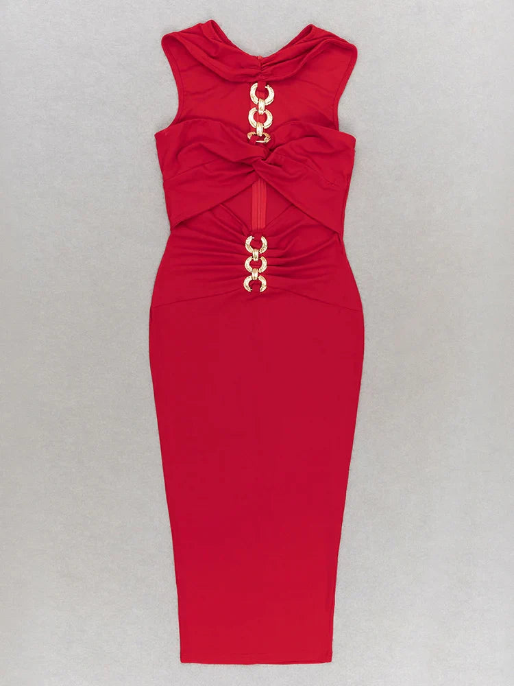 Red Metal Strapless Design Bodycon Midi Dress