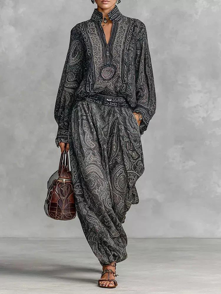 Retro Paisley Print Shirt Two-piece Set