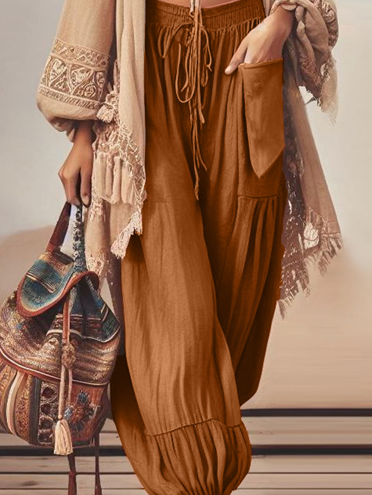 Retro Solid Color Drawstring Waist Pocket Bloomers Pants