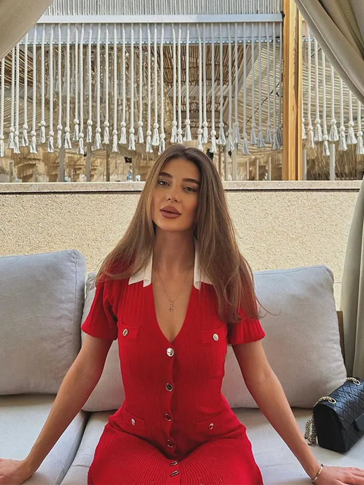 Ribbed Contrast Collar Short Sleeve Buttoned Midi Dress