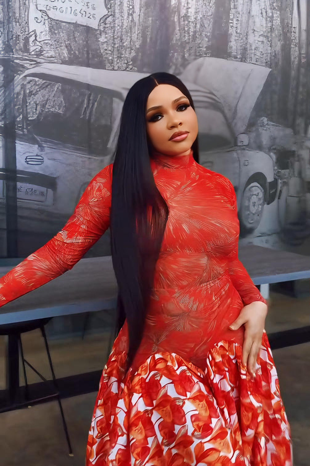 - Floor-length maxi dress with seamless transition from sheer mesh bodice to voluminous floral skirt