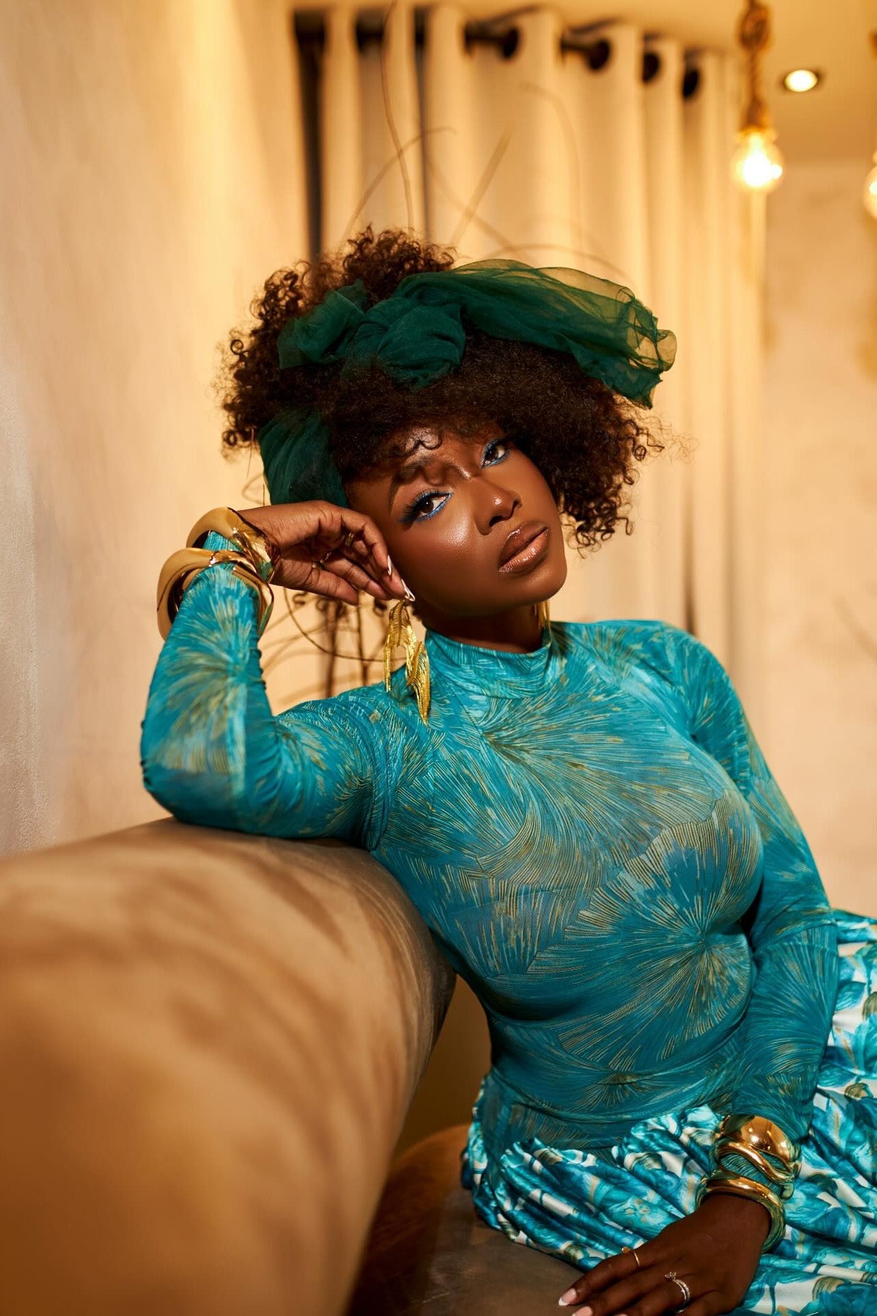 - High mock neck and long sheer mesh sleeves with subtle abstract blue tie-dye print