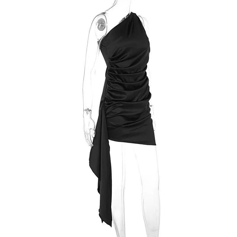 Satin Sleeveless One Shoulder Ribbon Mini Dress