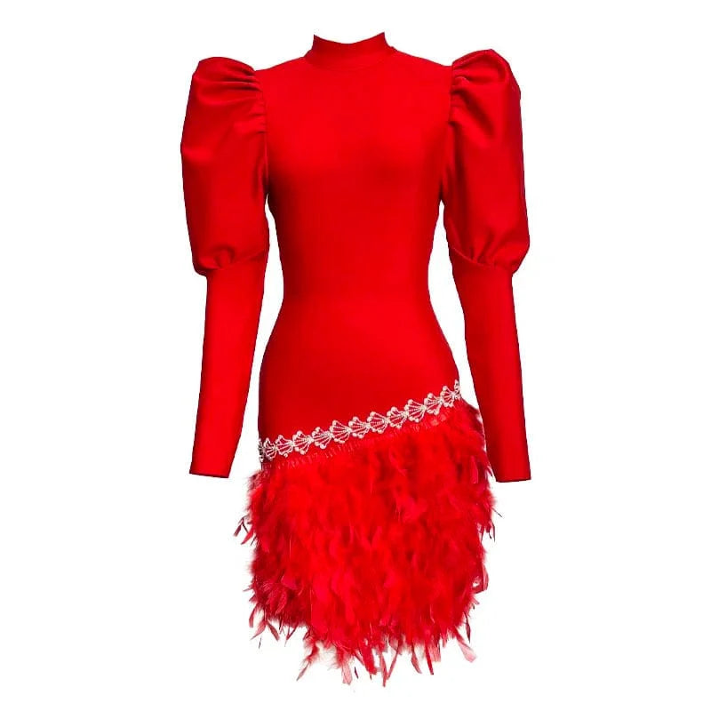Experience elegance and glamour with our Selina Mini Dress. Designed for women who love to stand out, this dress features long sleeves, feather detailing, and diamonds for a touch of luxury. The form-fitting bodycon style is perfect for your next evening out or a night at the club. Elevate your style in 2024 with this elegant party dress.Â