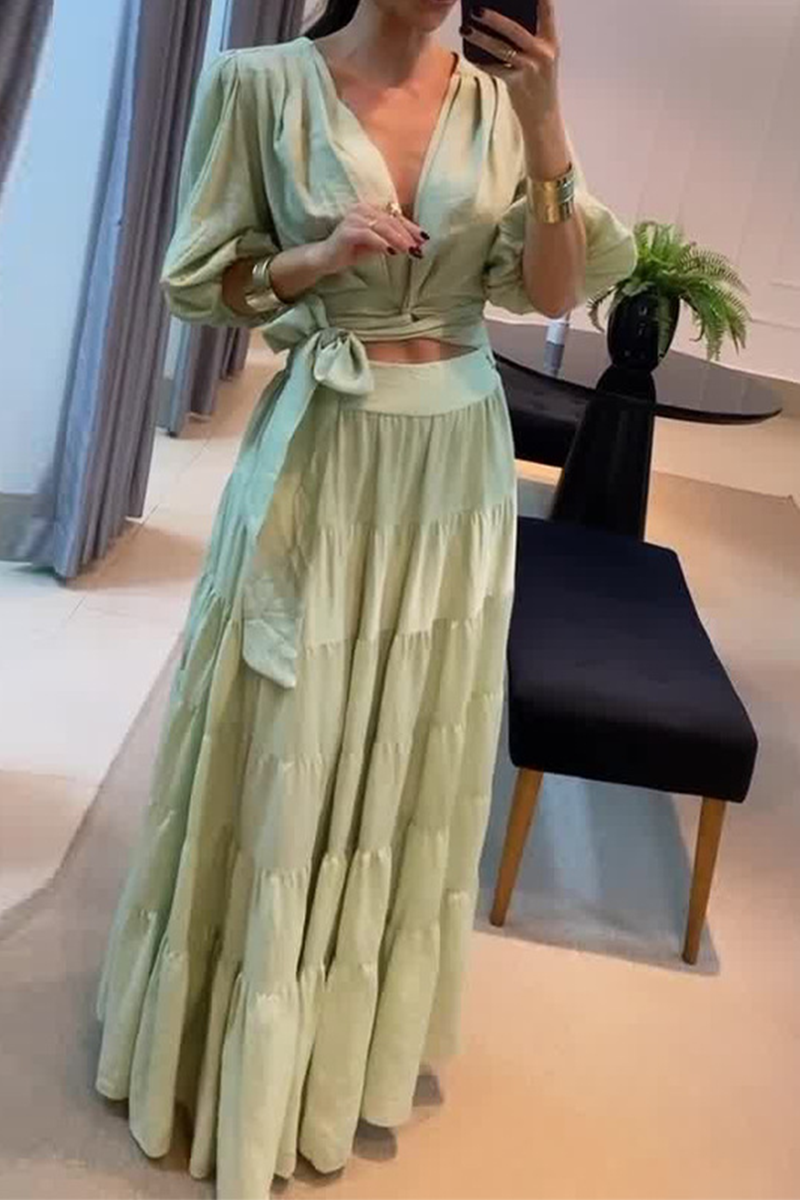 Sexy Daily Solid Color Lace Up Ruched V Neck Half Sleeve Two Pieces