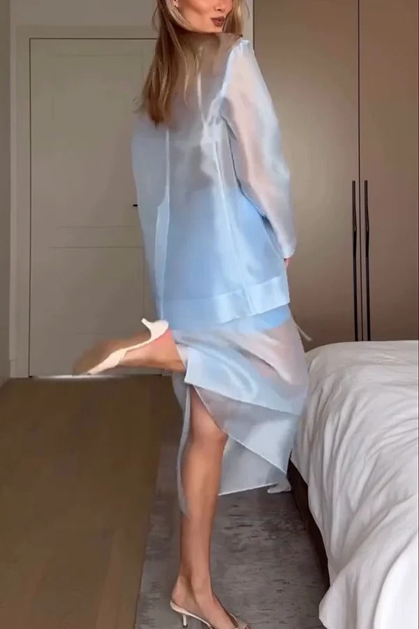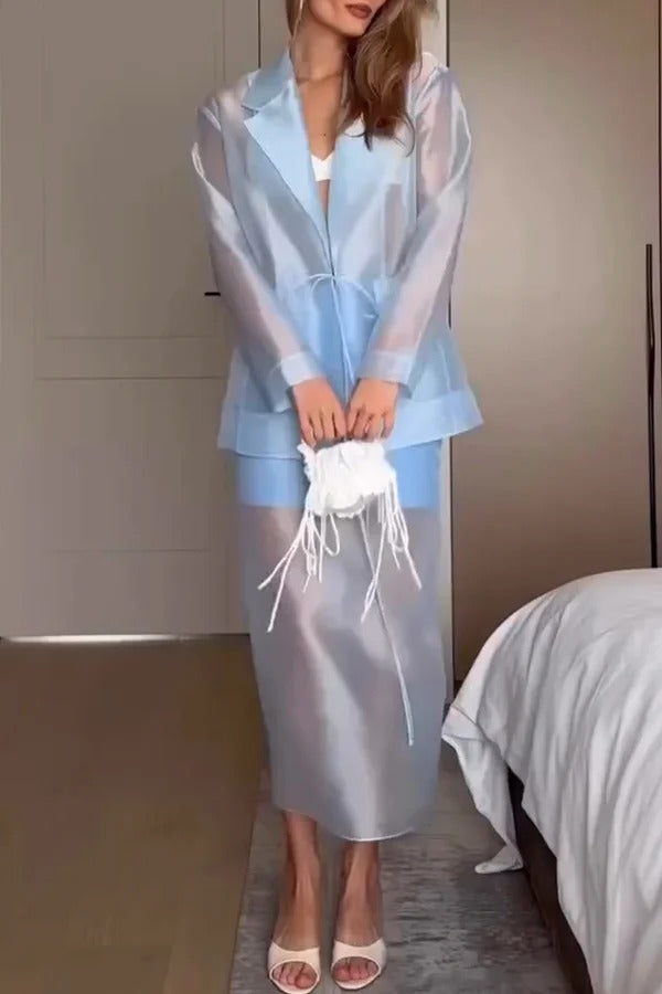 Simple and Light See-through Fabric Tie-up Long Sleeve Pocket Lapel Blazer