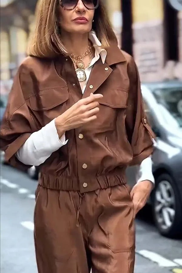 Street Charm Glossy Fabric Button Pocket Cargo Jacket and Elastic Waist Jogger Pants Set