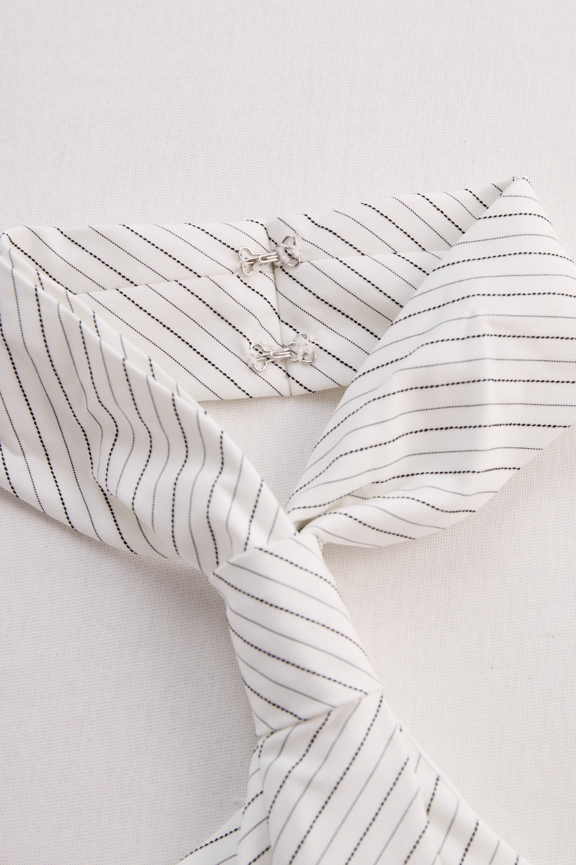 Featuring a sophisticated knot front and sleek pinstripe design, it's perfect for workdays or weekend outings with a tailored finish.