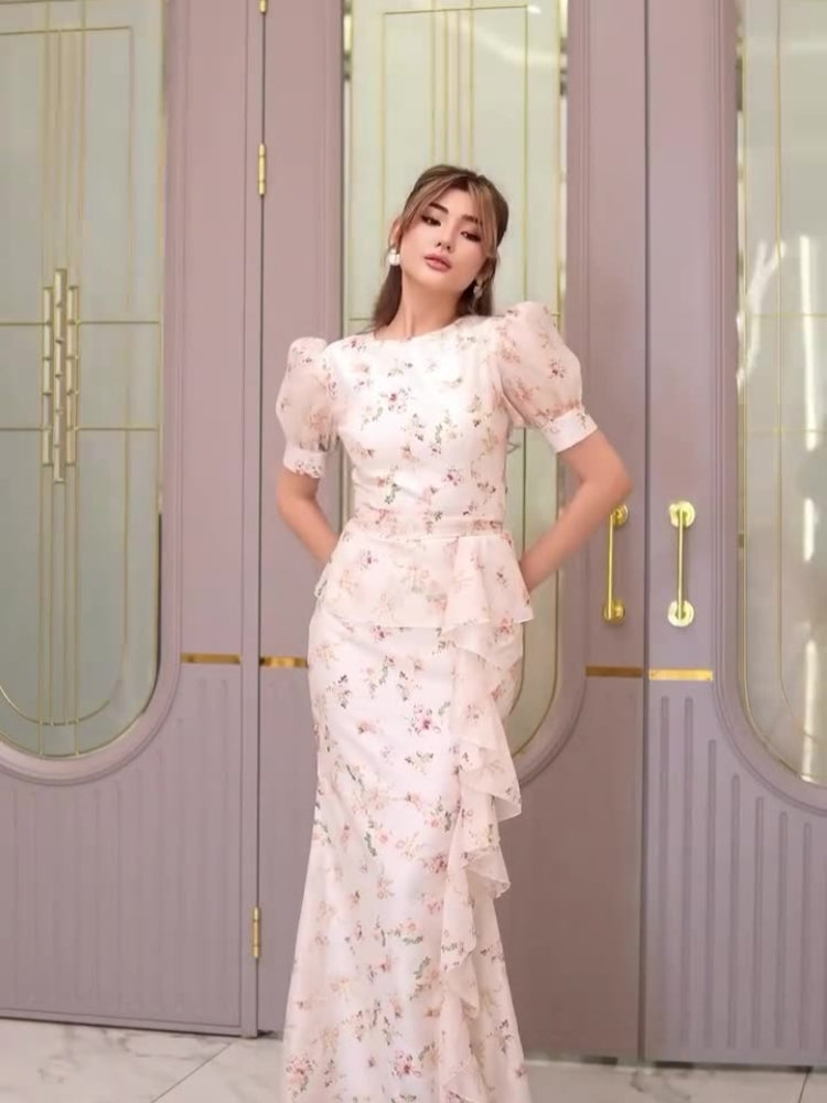 This charming floral maxi dress features short sleeves and a graceful ruffle hem that sways with every step. The defined waistline accentuates your silhouette while the vibrant print captures the essence of summer. Perfect for garden parties, vacations, or romantic dates.
